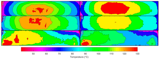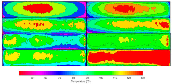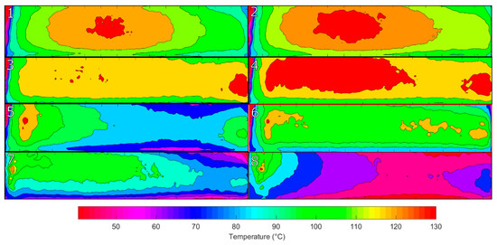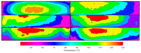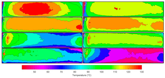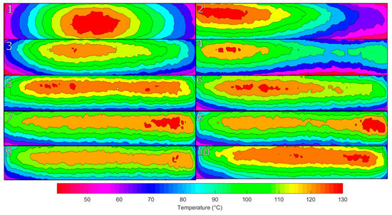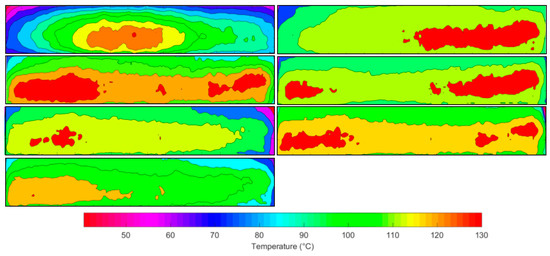 Figure 20 shows the temperature contour plot of the Greyscale–Threshold plus Memory method. The distribution of temperature across the element increases in uniformity with the hot spots reducing in size and becoming concentrated more on the edges of the element. The treatment of elements does not show signs of an oscillation of treatment but more a steady improvement to an optimum temperature profile. The variation between the lowest and highest temperature areas is around 20 °C.