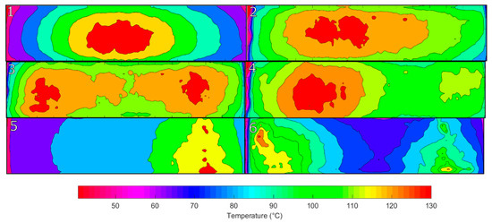 Contour plots of the surface temperature profile after each cycle of processing. Number denotes the process iteration. The scale within each image and across all the images applies to all of the plots.