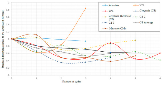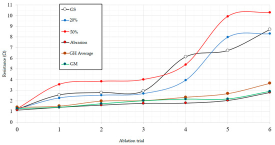 The total resistance of each element after each treatment cycle from each method is shown in Figure 22. This quantifies how much damage and change the element has upon experience through the treatment. The greatest change in resistance is seen in the 20%, 50% and GS methods. Within these three methods, the resistance increases from the first treatment. There is then a plateau as the resistance is unchanged until between 3 and 4 cycles of treatment, where the resistance of the element increases greatly until another plateau is reached. Within the abrasion, GT and GM methods, the resistance increases much more steadily, with the majority of cycles at a resistance lower than the resistance of the first ablation trial of the GS, 20% and 50% methods. These methods do not show the increase–plateau–increase behavior that the first three methods showed, indicating a much smoother treatment of the element.
