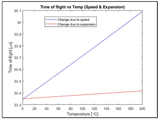 From the findings of Ihara et al., the relationship between ultrasonic velocity and temperature is almost linear within the range of 0 to 200 °C [22], as is the effect from the change in distance from thermal expansion. The simulations for expansion and ultrasonic speed were performed over this linear range. The result of this simulation is shown in Figure 3.