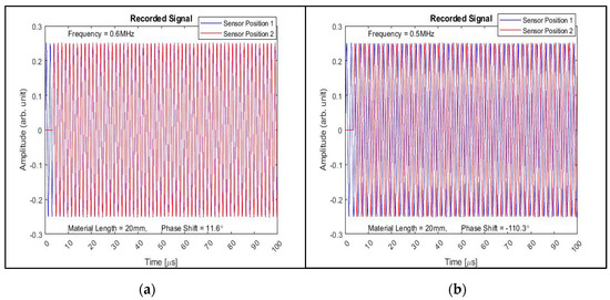 Two-frequency continuous wave method (TFcw) technique (a) 11.6 phase-shift at 0.6 MHz; (b) −110.3 phase-shift at 0.5 MHz.