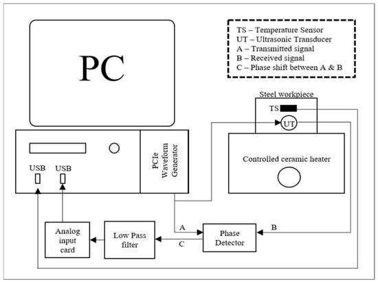 A sinusoidal waveform was generated using a Spectrum M2i.6022-exp arbitrary waveform generator (Spectrum Instrumentation, Ahrensfelder, Grosshansdorf, Germany) . The waveform was then sent to the input A port of the Analog Devices AD8302 (Analog Devices, Norwood, MA, USA) phase detection board and the transmitter probe of a 5 MHz ultrasonic transducer. Using steel (type EN24T) as the medium of propagation, the received signal from the receiver probe of the transducer was then sent to the input B port of the phase detector. The phase detector calculates the difference in phase between the transmitted and the received signal and sends the voltage equivalent as the phase difference value through the phase-out port of the phase detector board. To reduce noise from the ‘phase’ value, a low pass filter was used to cut off high frequency signals. A 3.4 Hz filter was used, however, a cut off frequency of similar value will give satisfactory results. An NI-9239 analogue input card (National Instruments, Austin, TX, USA) was used for data acquisition which was then stored using NI LabVIEW. A calibrated Maxim DS18B20 digital temperature sensor was used as reference and the measured temperature was recorded using WinTCal software, which is proprietary to the research group. A PT100 temperature sensor was used for monitoring finer resolution changes of 0.1 °C. Using a thermostatic temperature controller, a ceramic heater was used to gradually change the temperature of the steel workpiece in predefined steps. An ultrasonic transducer with a center frequency of 5 MHz and approximate bandwidth of 3 MHz was used. The effect of the change in temperature on the phase of the ultrasonic wave was recorded and will be discussed in the results section.