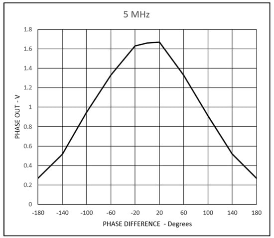 Using the setup described in Section 3.1, the AD8302 board was used to obtain the voltage equivalent values of phase-shift. A typical curve showing the relationship between the phase output (V) and the equivalent phase difference (Degrees) is given in Figure 7 and Figure 8, respectively. Figure 7 is the response specified in the datasheet while Figure 8 was obtained experimentally using the same parameters as those used for the phase-shift experiments −2 V input, 40 mV received signal and 5 MHz ultrasonic frequency.