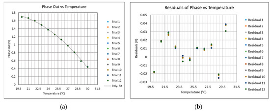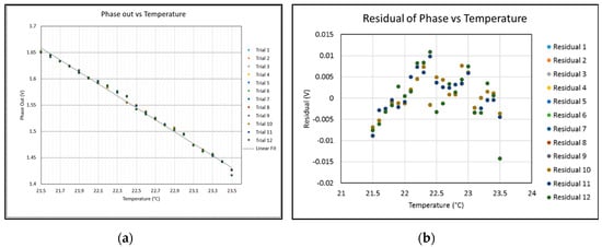 Results of 21.5 to 23.5 °C range in 0.1 °C steps (a) Phase output vs. temp; (b) Residual plot.