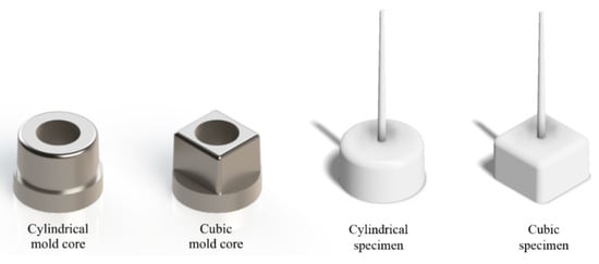 Mold cores and specimens with cylindrical and quadratic geometry.