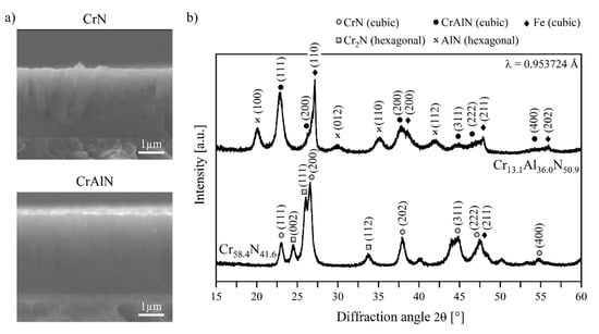 The deposition of the CrN and CrAlN films was carried out by using the industrial magnetron sputtering device CC800/9 Custom (CemeCon AG, Würselen, Germany). Two Cr targets and two AlCr20 targets, consisting of aluminum and 20 chromium plugs, each with a target size of 500 × 88 mm2, were mounted on the cathodes. For the CrN deposition, the Cr targets were operated with a cathode power of 4 kW and the substrate holder was biased with a voltage of −90 V. Ar and Kr were used as process gases and injected with a flow rate of 300 and 50 sccm into the chamber. The flow rate of N was set to 50 sccm and the working pressure of 400 mPa was N controlled. For the CrAlN deposition, the AlCr20 targets were powered with 5 kW and a bias voltage of −120 V was applied on the substrate holder. In this case, the flow rate of Ar, Kr, and N was set to 120, 80, and 300 sccm. The working pressure was 500 mPa and N controlled. The deposition time was set to 5520 and 21,240 s for CrN and CrAlN, resulting in a film thickness of approximately 2.6 and 3.0 µm, respectively.