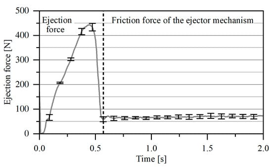 The force-time curves were measured during the ejection. Figure 3 shows the characteristic force-time curve during the demolding step. Within this context, the distance is calculated by multiplying the demolding time and ejector speed. It can be clearly observed that the measured force signal consists of the initial demolding process and a constant force component resulting from the inner friction of the entire ejector system. The experiments were evaluated by determining the maximum of the ejection force. In this regard, the system-related force component was determined with a reference cycle without injecting the plastic in order to subtract the value from the measured ejection force. For each core variant, a total amount of 50 injection molding cycles were carried out successively to calculate the average value of the ejection force. The data acquisition was started after reaching a stable operating state of the system to avoid an influence of start-up effects on the measurements.