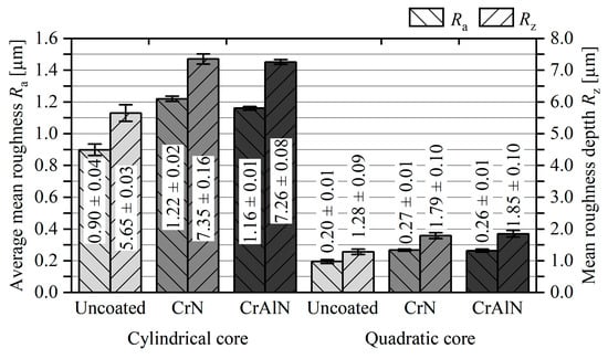 Average mean roughness Ra and mean roughness depth Rz of uncoated as well as as-deposited CrN and CrAlN coated cores.