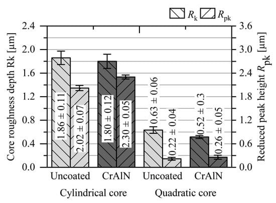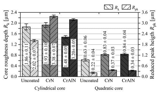 Core roughness depth Rk and reduced peak height Rpk uncoated as well as as-deposited CrN and CrAlN coated cores.