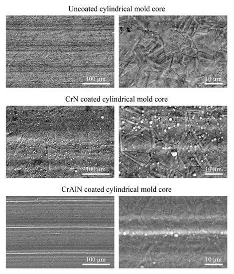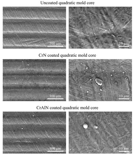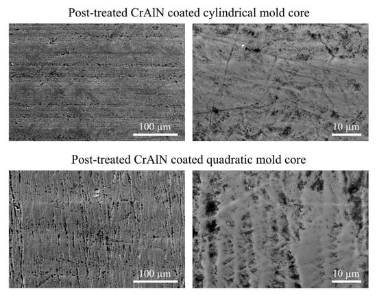 In order to be able to compare the PVD coated core surfaces with the uncoated reference, a mechanical post-treatment of the PVD films is necessary to reduce the surface roughness. For this purpose, the CrAlN coated cores are considered, as they exhibit lower ejection forces when compared to the CrN coated cores. The mechanical post-treatment of the surfaces successfully reduces the roughness to comparable values. The roughness parameters Ra, Rz, Rk, and Rpk of the mechanically post-treated CrAlN cores are shown in Figure 12 and Figure 13. It is clearly visible that the post-treated CrAlN coated cores exhibit comparable roughness values. Due to the post-treatment, the CrAlN coated cylindrical core has lower roughness values of Ra = 0.96 ± 0.01 µm and Rz = 5.32 ± 0.27 µm. The post-treated CrAlN coated quadratic core has also lower values of Ra = 0.17 ± 0.01 µm and Rz = 1.21 ± 0.14 µm. Lower values are also observed for the roughness parameters Rk and Rpk. The roughness reduction of the CrAlN coated cores is ascribed to the removal of the growth defects, as the SEM micrographs show in Figure 14. Moreover, it is visible that the surface of the post-treated coated surfaces is smoother.