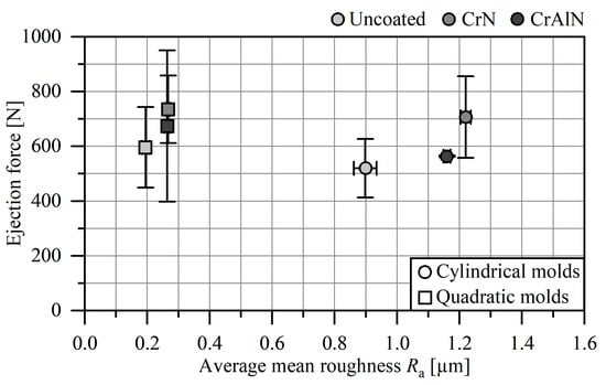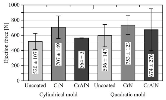 The maximum ejection forces when demolding the PP parts from the uncoated and coated cores are shown in Figure 8. It is noted that the cylindrical cores exhibit lower ejection forces compared to the quadratic cores. This fact is mainly attributed to the different shrinkage behavior of the molded part on the mold cores and the different roughness profiles. The shrinkage of the molded PP part results in higher contact pressures at the edges and corners, whereas the contact pressure is homogenously distributed onto the cylindrical core. Moreover, the cylindrical cores have a higher surface roughness than the quadratic variant. The higher roughness favors an increase of the deformative friction component. The roughness asperities hinder the sliding and plough the softer counterpart during the ejection process, thus leading to a higher friction. Both mechanisms need to be taken into account when comparing the ejection behavior of the mold cores with different geometries.