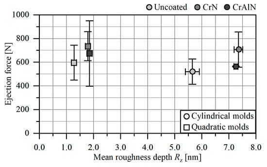 The different roughness profiles of the cylindrical and quadratic cores need to be considered for the ejection behavior, since the roughness asperities lead to an increase of the deformative friction component [7]. According to Sorgato et al., the molten plastic part replicates the mold topography during the filling, so that roughness asperities result in a mechanical interlocking between mold surface and processed plastic part [22]. As a consequence, a higher force is required to overcome the deformative friction component in order to initiate a sliding of the solidified plastic part. Therefore, the as-deposited CrN and CrAlN mold cores are marked by a rougher surface with distinctive roughness asperities, which result in a higher deformative friction component. This behavior is particularly noted when plotting the ejection forces against the surface roughness. Figure 9 shows ejection forces plotted against the roughness parameter Ra. For the cylindrical and quadratic cores, it is noted that the ejection force increases at higher Ra values. A similar behavior is observed for the roughness parameter Rz in Figure 10 as well as Rk and Rpk (not shown here). The influence of the roughness profile on the ejection force was already investigated in several works. Sasaki et al. varied the arithmetical mean roughness Ra from 0.016 to 0.689 µm for uncoated cylindrical cores and measured the ejection forces when demolding PP, polymethyl methacrylate (PMMA), and polyethylene terephthalate (PET) parts [19]. They noted that the ejection force increases with an increasing roughness Ra from 0.092 to 0.689 µm and ascribed this fact to the higher deformative friction caused by the roughness asperities. However, they measured the highest ejection force for the mold with the lowest roughness Ra of 0.016 µm and suggested that the adhesive friction mechanism contributes to higher ejection forces at lower surface roughness values. A similar influence of the roughness on the ejection force of molded PP parts was further noted by Pontes et al. [33]. In contrast, Chen et al. analyzed the adhesion behavior of CrN and DLC coated cores with a varying roughness Ra from 0.010 to 0.080 µm by using a specially designed adhesion force tester [34]. At these low Ra values, they noted that the adhesion force decreases for CrN and DLC films with a higher surface roughness and assigned this behavior to the lower adhesion. According to Pouzada et al., a region of an optimal surface roughness of the core favors the reduction of the ejection force [6]. Therefore, it can be concluded that a deposition of CrN and CrAlN films leads to a roughness increase, which contributes to a higher deformative friction component and consequently to higher ejection forces.
