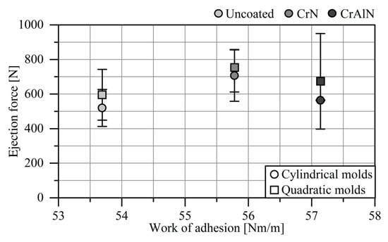 Besides the deformative friction component, the adhesive friction has also a significant influence on the magnitude of the ejection force. However, determining the adhesive friction component is highly challenging and difficult to implement in real applications. In a more theory-based approach, the work of adhesion of CrN, CrAlN, and uncoated AISI H11 with PP was determined [24]. For this purpose, surface energies as well as disperse and polar components were determined in contact angle measurements and used to calculate the work of adhesion. Within this context, the AISI H11 substrate has the lowest work of adhesion of 53.4 mN/m, while the CrN and CrAlN films exhibit slightly higher values of 55.8 and 57.1 mN/m. For polycarbonate (PC) and PMMA, Bobzin et al. observed a lower wettability for CrAlN against the plastic melts in comparison to uncoated AISI H11 [35]. Figure 11 shows the plot of ejection forces against the work of adhesion with PP. For the uncoated cores, it is noted that a low work of adhesion favors low ejection forces. In contrast, the CrN and CrAlN films have higher works of adhesion and consequently exhibit higher ejection forces. However, this relation is not linear, as the CrAlN film is marked by a higher work of adhesion with lower ejection forces when compared to CrN. On the one hand, the range of the work of adhesion of the three surface conditions is very narrow, so that the adhesion does not have a significant impact. On the other hand, the surface roughness is too high, so that the adhesive friction mechanism is less decisive for the magnitude of the ejection force, whereas the deformative friction component is the dominant mechanism.