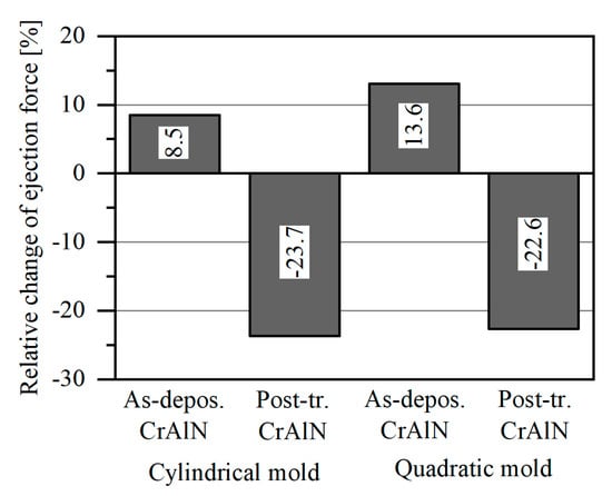 After adjusting the roughness to a similar surface quality as the uncoated cores, the mechanically post-treated CrAlN cores were mounted in an injection molding machine to determine the change of the ejection forces in comparison to the uncoated cores. Within this context, lower ejection forces were observed for the post-treated CrAlN coated cores. Figure 15 shows the relative change of the ejection forces of the as-deposited and post-treated CrAlN cores in comparison to the ejection forces of the uncoated cores. It can be noted that the ejection forces of the CrAlN coated cylindrical and quadratic cores are reduced to values by −23.7% and −22.6%. This behavior is ascribed to the reduction of the roughness asperities, which ensure an interlocking between the mold surface and plastic part. By weakening this interlocking mechanism, the required force to initiate the sliding of the plastic part is reduced and the magnitude of the adhesive friction component is more decisive for the ejection force. Consequently, a post-treatment of PVD coated cores with a low adhesion against PP is essential in order to reduce the ejection force in injection molding processes.