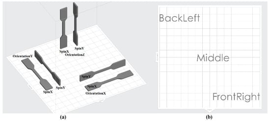 Part rotation (spin) is considered as a 2-level factor as shown in Figure 1a; part orientation and part position are 3-level factors as seen in Figure 1a,b, respectively. Finally, post curing time is a 3-level factor, with these factors being 0, 60 and 120 min. The post curing process used a 365 nm wavelength lamp with a measured power of 0.068 W/cm2.