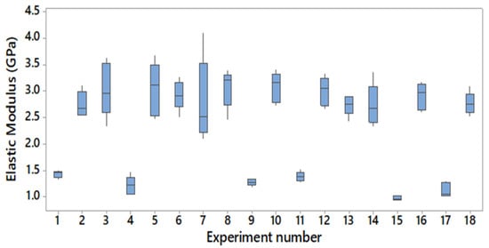 The boxplot of the elastic modulus obtained for all the experiments is shown in Figure 3; the blue bars are the range between the first and third quartile and the black lines represent the minimum and maximum values. Each bar represents the five results corresponding to five repetitions of the same experiment or printed batch; each experiment has a unique combination of factors as per Taguchi’s design. The average of each batch varies between 3.08 GPa and 0.97 GPa, representing a 216% increment on the elastic modulus for the same material printed under different conditions. However, the mentioned variation was with respect to the averages of each experiment, the maximum elastic modulus was reported to be 4.10 GPa while the minimum was 0.93 GPa, increasing the difference to a 342%. This change reported in the difference of results when comparing averages or individual elastic moduli is due to the high-observed standard deviation, especially for the post cured samples.