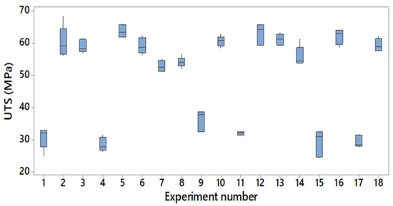 Similarly, the boxplot of the test samples’ ultimate tensile strength (UTS) is observed in Figure 4. The mean UTS values vary between 63.8 MPa and 28.6 MPa; this again showed a 123% difference between the minimum and maximum values on average of each batch and 181% when comparing global maximum and minimum individual results (24.3 MPa and 68.5 MPa, respectively). This time, the standard deviation is reported to be lower, hence the difference when comparing global maximum and minimum values and maximum and minimum averages is lower.