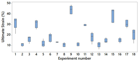 Finally, the same method was used for the ultimate strain expressed as a percentage (%). The corresponding boxplot can be observed in Figure 5. In average, all experiments failed between 11% and 44% strain, representing an increment of 314%; however, the global minimum ultimate strain was reported to be 6% and maximum ultimate strain was 49%, meaning that the specimen that broke at the highest ultimate strain overcame more than seven times more strain than the one that broke with minimum strain.