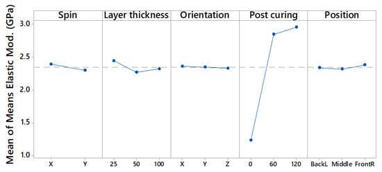 Finally, Figure 6 represents the lot of Means of the elastic modulus of each individual level. A Plot of Means represents the mean result obtained from all experiments grouped by factors and levels; given the interaction between factors, this plot is used to compliment other analysis and to determine which factors are important and which ranking these factors follow. Figure 6 confirms that post curing is the most important factor. From all the 90 experiments, the average elastic modulus of those that were post cured for 2 h was 2.96 GPa; the samples that were not post cured had an average value of 1.24 GPa. It is observed that the elastic modulus results did not undergo a relevant variation when varying other factors.