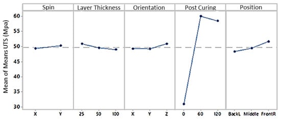The mean UTS values can be found in Figure 7. The most significant differences are introduced by the different post curing time levels, in this case, the mean UTS ranges between 53 MPa and 64 MPa for one hour post curing and 29 MPa and 36 MPa without post curing.