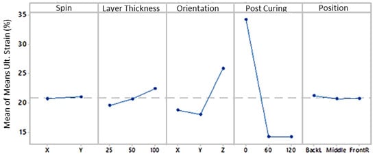 Following the same analysis procedure as above, the ultimate tensile strain is studied. The highest ranked factor is, one more time, the post curing time, that represents 60% of the response variation, followed by the part orientation representing 22%. The signal to noise ratio values can be observed in Table 4.