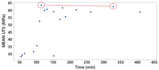 As observed in Figure 9, similar UTS results can be obtained from samples that take around 2 h, as well as the samples that take 5 h to print, with the latter being more than two times more expensive in terms of manufacturing time. On the figure, each point represents one of the 18 experiments that were run. This study highlights that combinations of factors that lead to long manufacturing time should not be associated with the obtainment of better UTS results. Additionally, shorter manufacturing times, below 100 min corresponding to non-post cured parts, show about half UTS (30 MPa) than the average post cured samples (60 MPa).