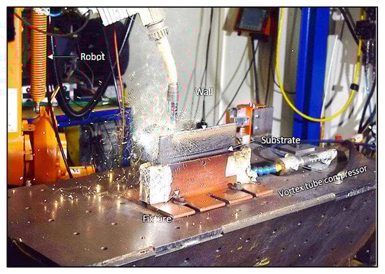 The experimental setup is as shown in Figure 4. The process used in this work was the CMT®, which is an advanced process with wire feed control and usually employed for WAAM. This process was developed by Fronius in order to perform welding with colder melt pool []. This characteristic is reached due to small arc length (low arc pressure) and short arcing time. The torch manipulator used for this project was a commercial welding robot. For cooling the walls after each layer deposition and achieve inter-pass temperature as room temperature as fast as possible, compressed air aided by a vortex tube was employed.