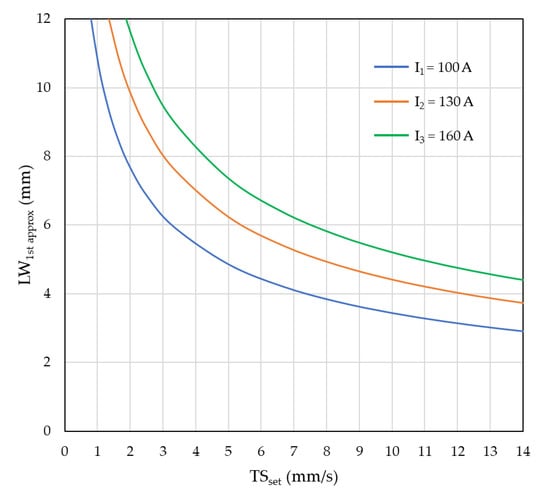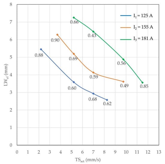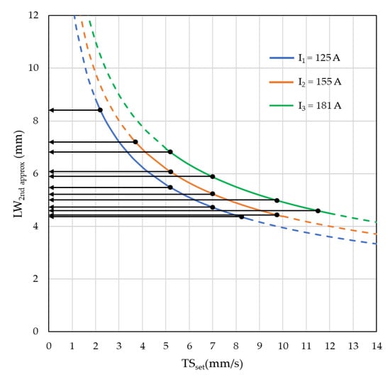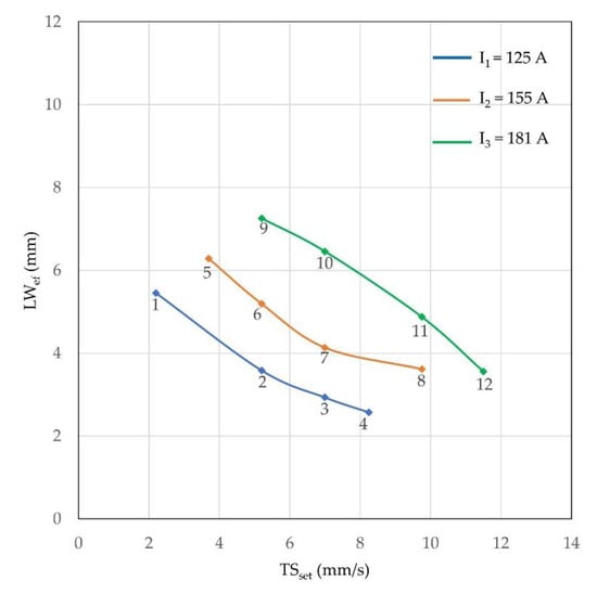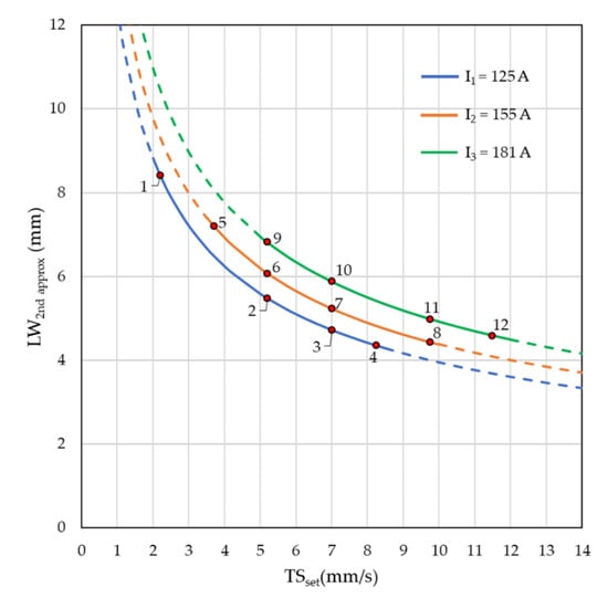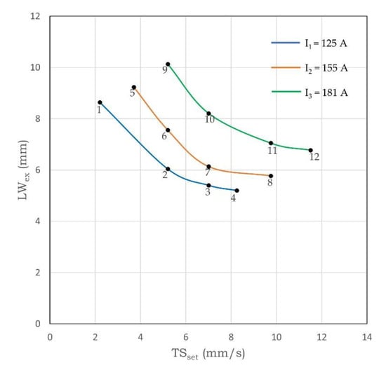 The first approximation operational map (Figure 6), as suggested in the previous subsection, although allowing to visualize the geometric trends of the layer widths (LW) as a function of the operational parameters (mean current (Im) and set travel speed (TSset) for a given process-consumable), is still very limited for this work purpose. The first limitation regards to actual values of Im and the limits of TSset, to attend the second commandment. Hence, some experiments were planned and carried out as follows.