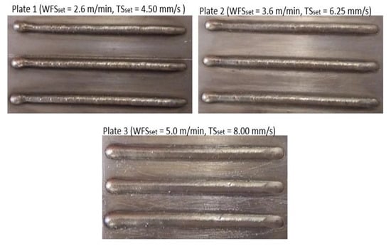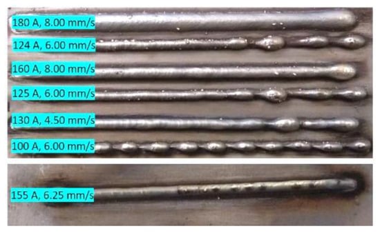 Several bead-on-plate depositions (single beads-one layer) were carried out on a plain carbon steel substrate (178 × 75 × 6 mm). After finding a sound bead for a combination of WFS and TS, for each deposit, the set wire feed speed (WFSset), correspondently the mean current (Im), was increased. To keep the same deposition volume of the beads, the set travel speed (TSset) was proportionally increased. The most significant replicated data after exploratory runs is shown in the bead-on-plate deposits illustrated in Figure 7.
