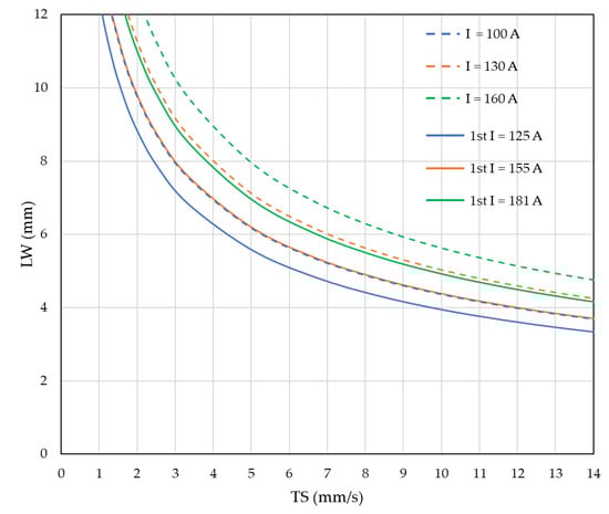 The relation between travel speed (TS) and layer width can be found out as follows: