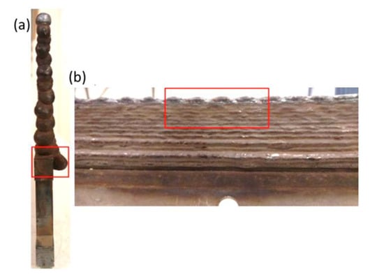 Unacceptable imperfections during WAAM of sequential single layers: (a) material flow beyond the side wall; (b) top surface undulation.