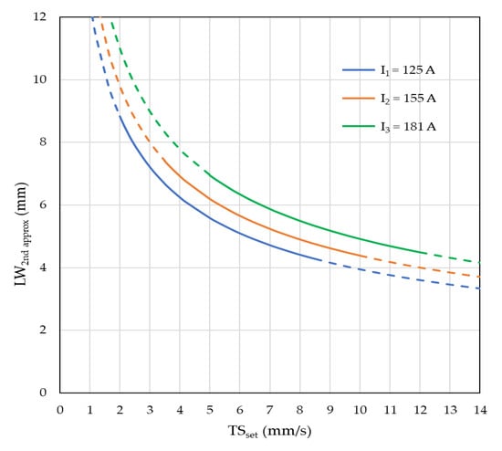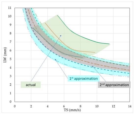 Second approximation operational map with actual current range and representing the boundaries for workable limits of current and travel speed (LW is still estimated by Equation (5)).