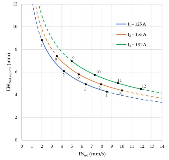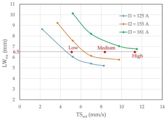 The design for the experiments as planned used three blocks (one block representing each Im, i.e., Imin, Imid, and Imax.) rather a typical 31 + 41 factorial design, due to the dependence of the operating TS to the Im level (to avoid statistical bias). These independent variables were chosen because they govern the external layer width (response) during WAAM. Each experimental point was initially laid in such a way that four experiments for each Im were evenly distributed over the workable TSset range. Figure 12 represents the initially proposed design for the experiments.