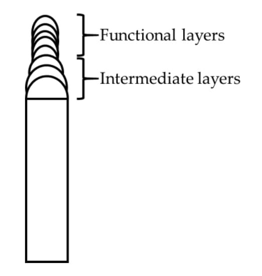 To pick several plate thicknesses, or to machine thicker plates to the required thickness, in order to accomplish this requirement is costly, inefficient, and ecologically incorrect. Therefore, an alternative approach would be to start the deposition on a wider substrate edge with a LW larger than the target one. Then, subsequent intermediate layers would be built progressively with smaller LW, up to achieve the target layer, as illustrates in Figure 15. One can consider that a step of 1 mm for the intermediate layers from the start LW to the target LW would be sensible to keep the same heat flow. In addition, arbitrarily, one can consider it economically reasonable to have a maximum of six intermediate layers over a starting commercially available substrate thickness.