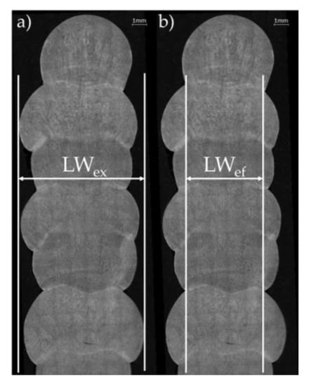 Walls produced by WAAM have lateral surface waviness due to which peaks and valleys are observed when one investigates the cross-section of the walls. Therefore, the response for this experimental design was the layer width (LW), considering that the other macro imperfections were not accepted. As indicated in Figure 16, there are two ways to quantify LW. The external layer width (LWex) is represented by the widest dimension, considering the waviness peaks of the cross-section wall. The effective LW (LWef), in turn, is represented by the narrowest dimension, considering the (waviness valleys) of the cross-section wall.