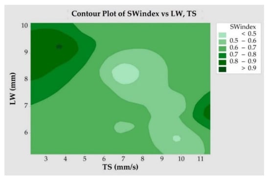 According to Equation (7), the SWindex for all the experimental walls were calculated and the results were plotted on the effective LW working envelope, as shown in Figure 20. The results demonstrated that the SWindex in the middle region of the working envelope is relatively lower than on the extremities of TSset (i.e., for samples 1, 5, and 12). The reason for this lies in the second commandment (refer to Section 2), which resulted in the criterion for selecting TSset range. As these samples (1, 5, and 12) have the TSset closer to the actual border of the working envelope (not totally searched during Section 3.2), so, consequently, these have more surface waviness and hence require maximum material to be removed during post-operation. Therefore, the SWindex also assumes the role of defining refined limit to working envelope. On the other hand, Figure 21 is a powerful visualization tool to identify the regions of minimal SWindex, as wished in WAAM production planning.