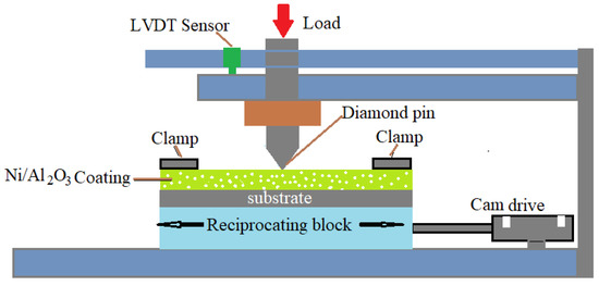 The wear tests were completed using a linear reciprocating pin-on-plate test machine equipped with a diamond pin of diameter 3 mm, mounted in a 90° cone. A schematic of the test setup is shown in Figure 1. The pin slides reciprocally against the coated specimen and the wear performance measured by monitoring the changes in the depth of the wear scar as a function of time for 30 min. The wear rate was determined by dividing the scar depth by the duration of the wear test. The tests were conducted under non-lubricating conditions in air having a relative humidity of 87 ± 5% and an ambient temperature of 295 ± 1 K. To ensure repeatability, three specimens were heat treated and tested for each test condition. The applied load was varied between 10, 25, and 40 N. The test data were collected using a 16-bit 100 kHz data acquisition system (USB-1608FS model from micro DAQ, Contoocook, NH, USA).