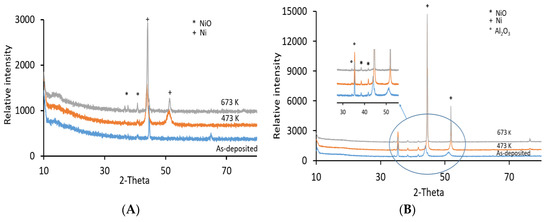XRD spectra of the coatings treated in oxidizing conditions for heat treatment temperatures of 473 K and 673 K: (A) pure-Ni, (B) Ni/Al2O3.