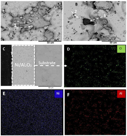 SEM micrograph of (A) surface of the as-deposited Ni/Al2O3 coating; (B) detailed view of point-1; (C) Cross-section of the Ni/Al2O3; and EDS Maps of the cross-section of the Ni/Al2O3 coating, (D) Nickel (Ni), (E) Oxygen (O), (F) Aluminum (Al).