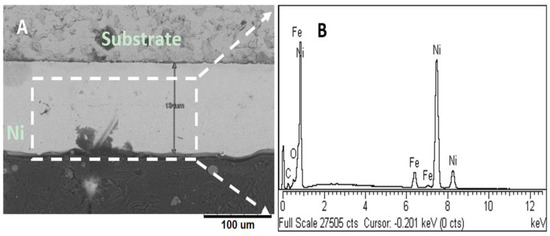 SEM micrograph of; (A) cross-section of the as-deposited Ni coating and (B) EDS analysis of the coating cross-section.