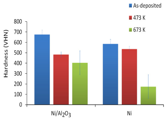 Figure 6 shows the effect of processing temperature on the micro-hardness of the coatings. The as-deposited Ni/Al2O3 coatings recorded a hardness of 664 VHN. When the Ni/Al2O3 sample was heat-treated, the hardness number decreased to 450 VHN at 473 K and 395 VHN at 673 K. When the pure Ni coating was heat-treated, the hardness number decreased from 585 VHN for the as-deposited coating to 174.4 VHN for the samples heat-treated to 673 K.