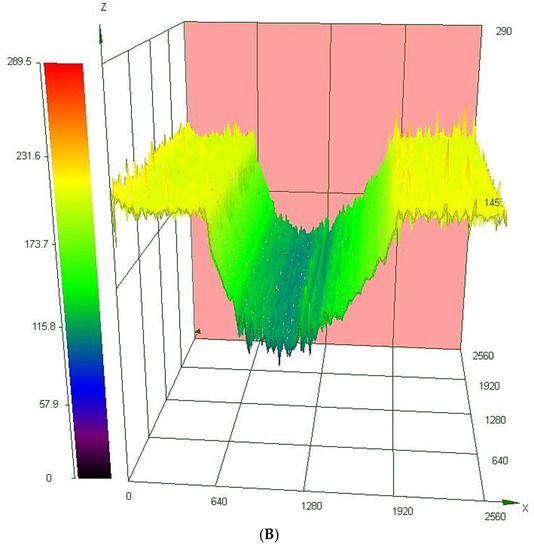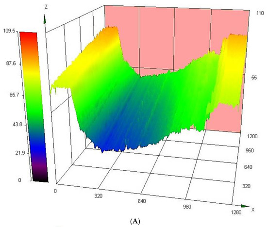 Confocal micrographs showing the depth of the wear scars recorded for: (A) Ni/Al2O3 as-deposited coating, (B) Ni/Al2O3 heat-treated to 673 K.
