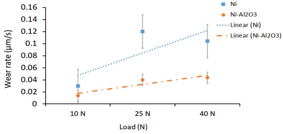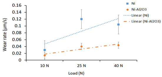 The effect of load on the sliding wear behavior of the as-deposited coatings was evaluated by varying the load from 10 N to 40 N. The wear rates recorded for each coating are shown in Figure 8. The best-fit curve through the data suggests that the wear rate of the as-deposited Ni coating increased with increasing load from 0.05 µm/s to 0.11 µm/s. Similarly, for the Ni/Al2O3 coating, the wear rate increased from 0.02 µm/s at 10 N to 0.04 µm/s at 40 N. The results show that in the as-deposited condition, the Ni/Al2O3 nanocomposite coating had better wear resistance than the pure Ni coatings.