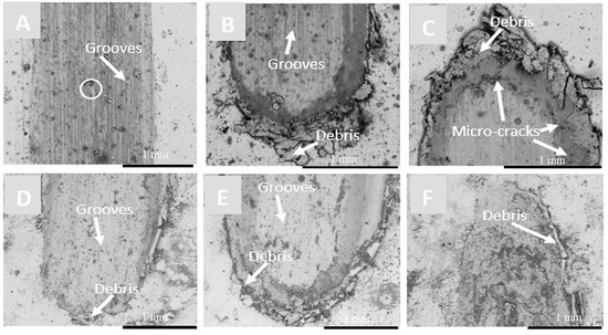 SEM micrograph of the wear track for Ni and Ni/Al2O3 coatings: (A) As-deposited, (B) Heat treated to 473 K, (C) Heat treated to 673 K; and Ni coatings (D)As-deposited, (E) Heat treated to 473 K, (F) Heat treated to 673 K.