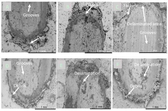 The wear scars of the as-deposited Ni coatings tested as a function of load for 10 N, 25 N and 40 N are shown in Figure 10A–C respectively. The surface of the coatings tested using 10 N contained a series of parallel grooves with small pin holes present in the groove track. The absence of wear debris suggests that at this load, the yield strength of the coating was not exceeded. However, increasing the load to 25 N and 40 N resulted in an expansion of the debris field and the formation of additional surface defects that are not found at a lower load. Similar, to the surface of the as-deposited Ni/Al2O3 coating, tested using 10 N, contained parallel grooves and large sheet-like debris at the bottom of the wear track with large delaminated regions (see Figure 10D–F). Close examination of the wear debris shown in Figure 10C suggests that bulk flaking may have also occurred at 25 N and 40 N test loads. At higher test loads, the yield strength of the coating was exceeded, which is believed to be responsible for the larger debris fields formed around the wear scars.