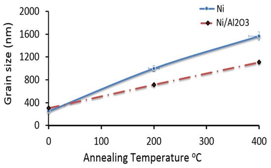 The presence of the nanoparticles in the Ni/Al2O3 matrix is expected to have a pinning effect on the grain boundaries, thereby retarding grain growth as the annealing temperature increased. Smaller particles that are coherent with the lattice are more effective in pining grain boundaries as predicted by the Zener model [22]. When compared to pure nickel coating, the large reduction in hardness and increase of the grain size observed in the pure Ni coating were attributed to grain growth due to the absence of grain boundary restraint provided by the nanoparticles as shown in Figure 12 [16]. Similar observations were made by Chang et al. who evaluated the impact of heat treatment on Ni/SiC coatings produced by electrodeposition [5]. The relationship between hardness, H, and grain size, d, can be explained by the Hall-Petch equation, which is presented in Equation (1) and shows that the hardness of the coating decreases as the grain size is increased. The grain size was determined by calculating the ASTM grain size number.