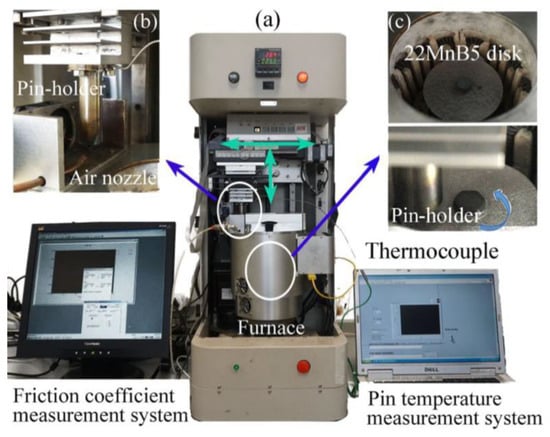 Thermal simulations and wear tests at elevated temperatures have been carried out on a Universal Mechanical Tester UMT-3 tribometer by Bruker™(Billerica, MA, USA) equipped with an electrical furnace (see the whole apparatus and some details in Figure 2). The furnace allots to heat the Al–Si coated 22MnB5 black up to 1000 °C, following a predefined thermal cycle measured by means of K-type thermocouple located inside the furnace and controlled in a closed-loop configuration by a controller unit. The blank is fixed on a rotation table inside the furnace driven by an electrical motor. The pin, mounted on the pin holder, can be moved along both the vertical and horizontal directions. The pin load and torque are measured by ultra-accurate strain-gauge sensors, which are used to calculate the friction coefficient during testing according to the Coulomb’s law. In order to ensure a constant load, the normal force is measured by a dedicated load cell, and its signal is used by the machine controller to adjust the pin vertical position. During the test, the pin temperature is constantly measured by a K-type thermocouple embedded inside it.