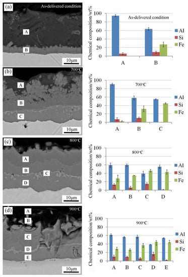 A clear influence of the heating temperature on the evolution of the Al–Si coating can be appreciated. The coating of the blank in as-delivered condition presents two zones: (A) the Al–Si coating, and (B) the interface area between the steel substrate and the coating. This interface zone is made of a ternary mixture containing approximately 64% aluminum, 9% silicon, and 27% iron. The coating of the blank heated at 700 °C presents instead three zones: (A) characterized by the presence of iron, contrary to the as-delivered condition, proving that iron starts diffusing from the interface area to the coating; (B) with a higher presence of iron; and (C) close to the substrate with the highest amount of iron. When the blank is heated at 800 °C, the coating shows four zones: (A), (B), and (C) are characterized by a higher amount of iron compared to the 700 °C sample whereas zone (D) close to the substrate presents a little amount of silicon. When the blank is heated to 900 °C, the number of layers continues increasing and the coating is composed of approximately 5 zones (A–E). In these five zones, the lowest amount of the aluminum is 39% in zone D and the lowest silicon amount is 2% in zone E, which is the same of the 800 °C blank.