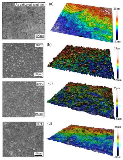 Scanning electron microscopy (SEM) images and 3D profiler maps of the coating surface heated at different temperatures: (a) as-delivered condition, (b) 700 °C, (c) 800 °C, and (d) 900 °C.