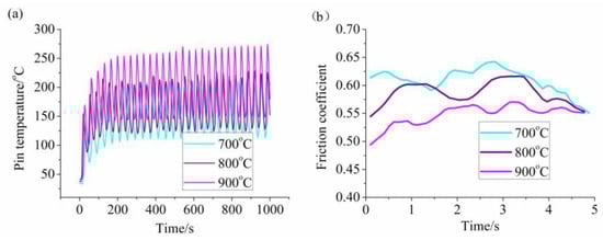 (a) Evolution of the pin temperature and (b) friction coefficient with time at varying temperature.